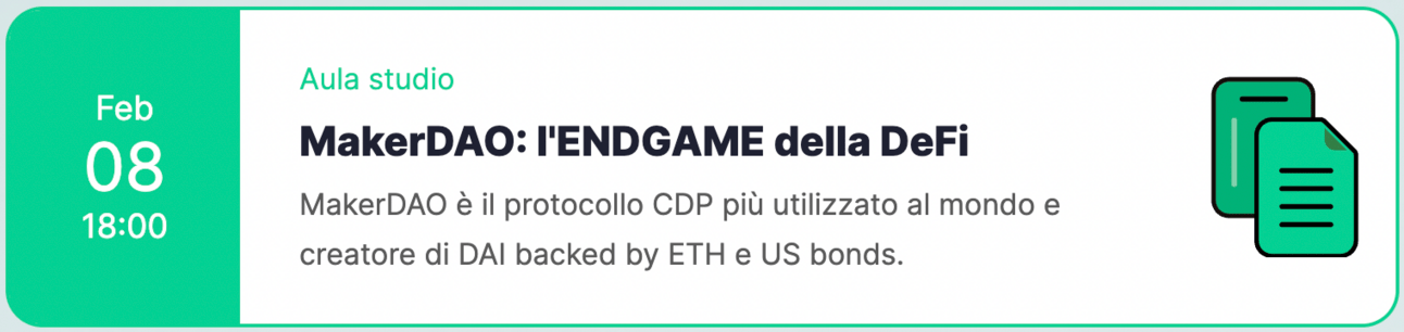 Giovedì 8 febbraio, ore 18:00: serata dedicata a MakerDAO e alla sua stablecoin. Affronteremo diversi argomenti tra cui i meccanismi che governano il peg di DAI; approfondiremo poi ENDGAME, con un occhio alla roadmap pubblicata proprio da MakerDAO.