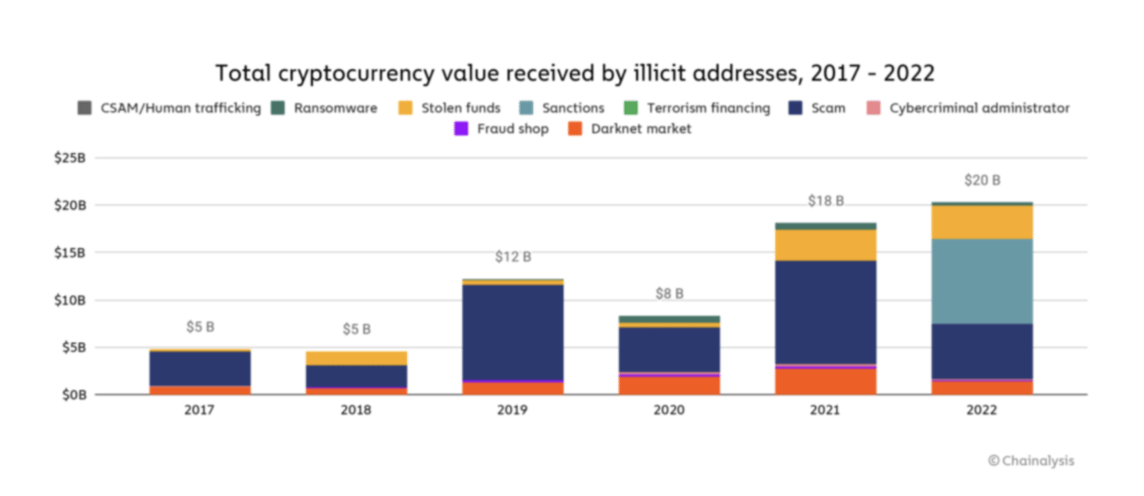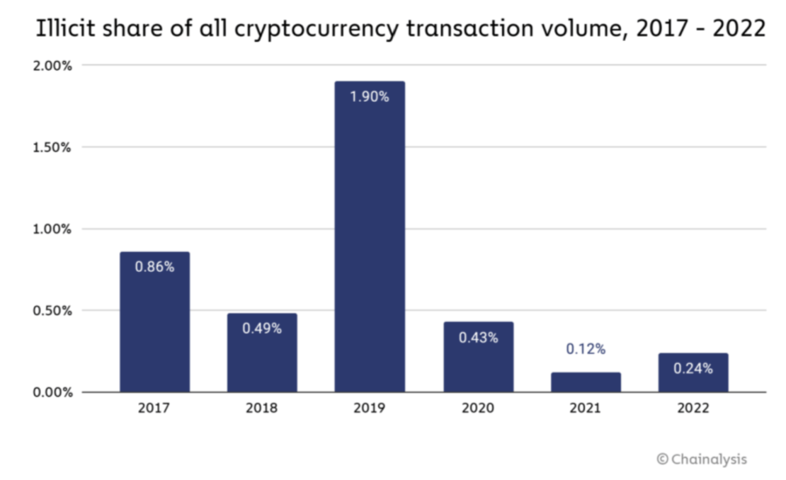 Nel 2022, secondo una ricerca di Chainanalysis, il totale transato proveniente da attività illegali in tutto il panorama crypto rappresenterebbe solo lo 0,24% del totale: circa 10 volte meno la media del mondo tradizionale.
