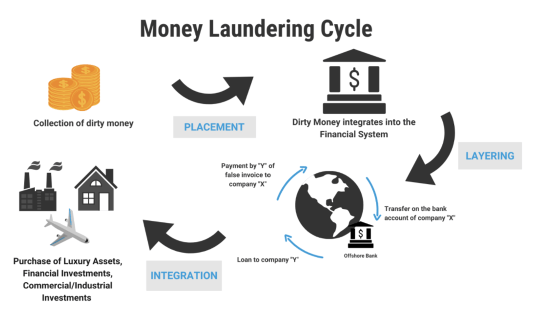 Come funziona il riciclaggio di denaro derivante da attività illecite? Senza perderci in troppi tecnicismi, lasciamo un grafico delle Nazioni Unite che lo sintetizza nei suoi vari passaggi. Indovinate un pò? Buona parte di questi movimenti avvengono proprio in pancia ai sistemi finanziari tradizionali.