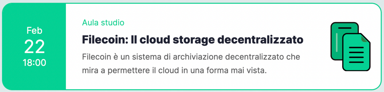 Giovedì 22 febbraio, ore 18:00: tutto pronto per la nostra aula studio su Filecoin, il cloud storage decentralizzato. In questo appuntamento daremo spazio alla visione generale del protocollo, al suo funzionamento e anche al token FIL, compresa un’analisi tecnica dedicata.