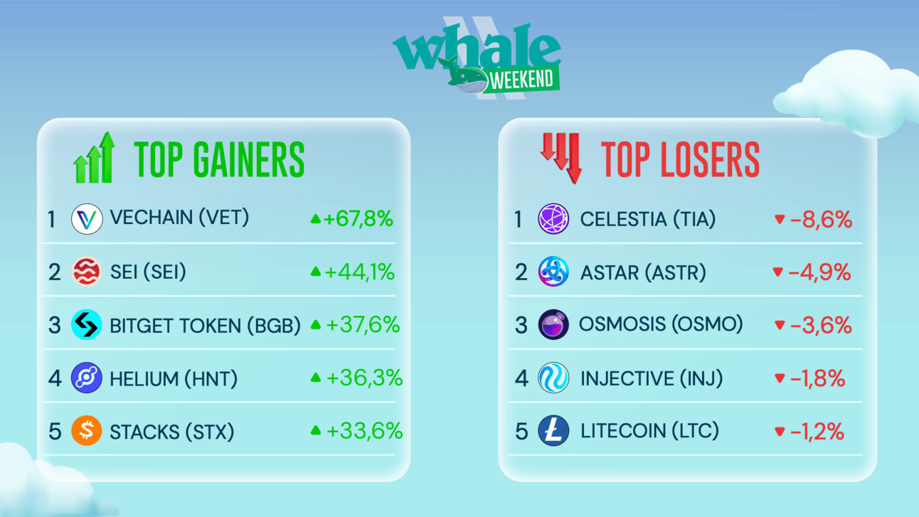 Tra i migliori, VeChain (VET) e Sei (SEI), che sostituiscono Celestia (TIA) e Injective (INJ), per molte settimane tra i “top gainers”. Da un lato per una correzione del prezzo fisiologica dopo dei rally durati molti mesi, dall’altro per i diversi annunci (per VET, soprattutto) che hanno attirato le attenzioni degli investitori.