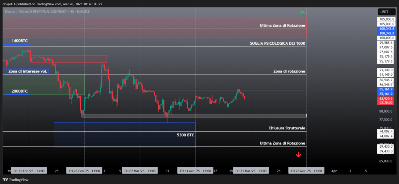 Al ribasso i sub $80.000, con il livello di ultima resistenza a $69.420. L’impatto con questa zona e un’accumulazione in quest’area sarebbe ideale in termini di rischio rendimento per un posizionamento long