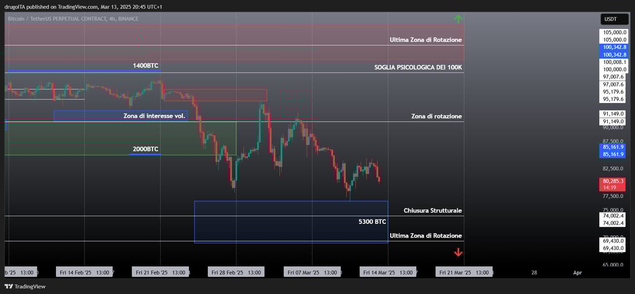 Se dovessimo creare un costrutto di bottom in queste settimane, le probabilità di un'ultima induzione finale al ribasso sono concrete. Le zone da tenere sotto stretta osservazione sono i massimi dell’impulso precedente e quindi la chiusura strutturale, intorno ai $74.000, più l’ultima zona di rotazione a $69.500.