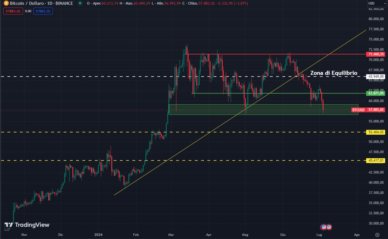I movimenti di Bitcoin da marzo a oggi non sono stati molto positivi. Dopo aver raggiunto un nuovo massimo storico a 73.5k e tentato un paio di attacchi alla resistenza nei mesi di aprile e giugno, il prezzo è sceso significativamente.