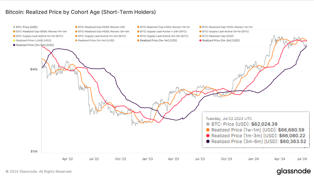 Ma come si stanno comportando le “diamond handsˮ rispetto a Bitcoin? Gran parte delle persone che hanno comprato nellʼultima settimana-mese (1w-1m, linea arancione) hanno un prezzo medio dʼacquisto di quasi $67k. Poi troviamo i “mediumˮ holder che hanno acquistato negli ultimi 3 mesi, con gran parte delle posizioni a un prezzo medio di $66k (1m- 3m, linea rossa). Infine, il dato più rilevante: il prezzo medio di acquisto da parte di wallet che detengono Bitcoin dai 3 ai 6 mesi (3m-6m, linea viola), a $60k.