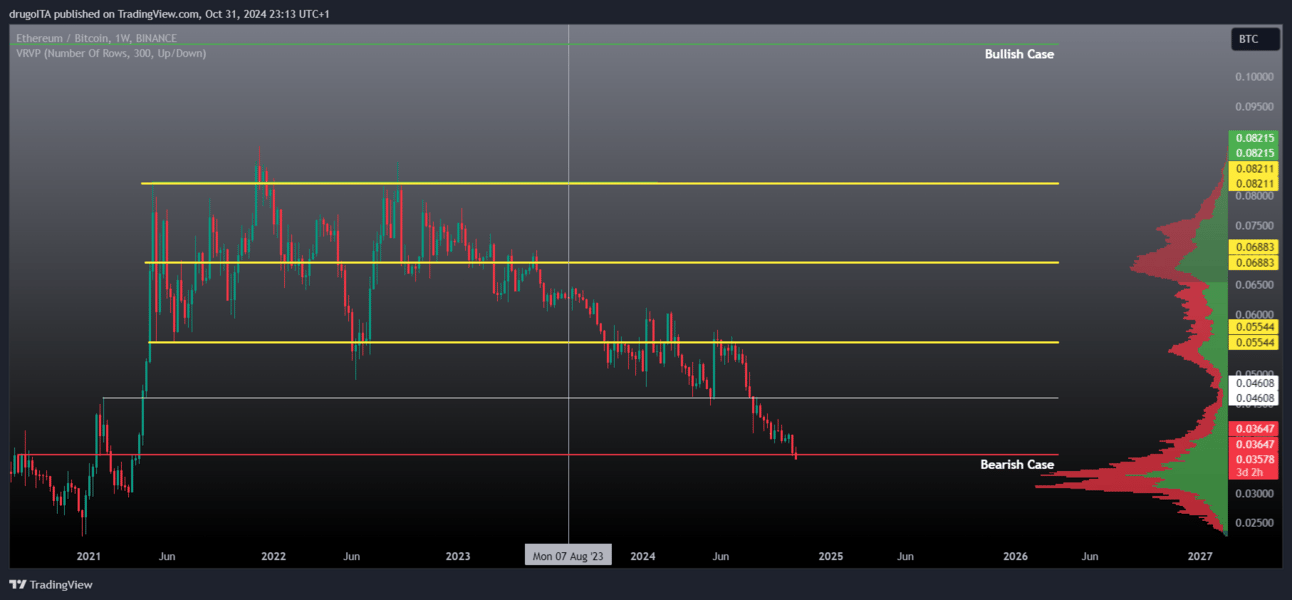 Per quanto riguarda i livelli per la ripartenza, ĆØ essenziale recuperare gli 0.045 BTC per ETH e procedere poi a riconquistare gli 0.055, che sono stati la base del grande range di distribuzione.